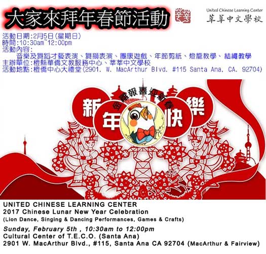本校將於二月五日(星期日)上午十時半,於橙縣華僑文教中心舉辦2017全校農曆新年“大家來拜年”活動, 敬邀您全家前來參加共同慶祝!